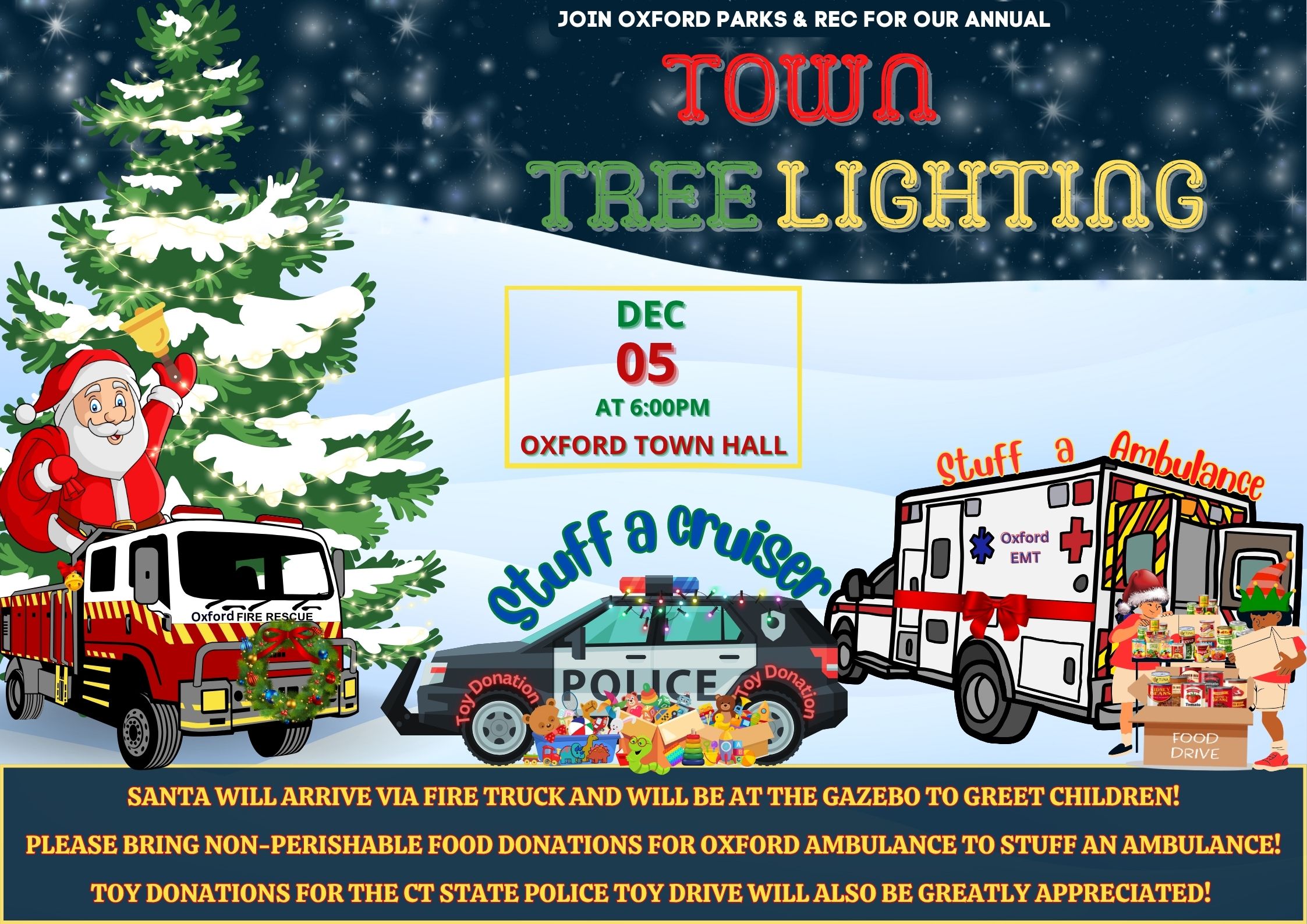• Join us at Oxford Town Hall on Friday Dec 5th beginning at 6:00 pm for our Annual Town Tree Lighting