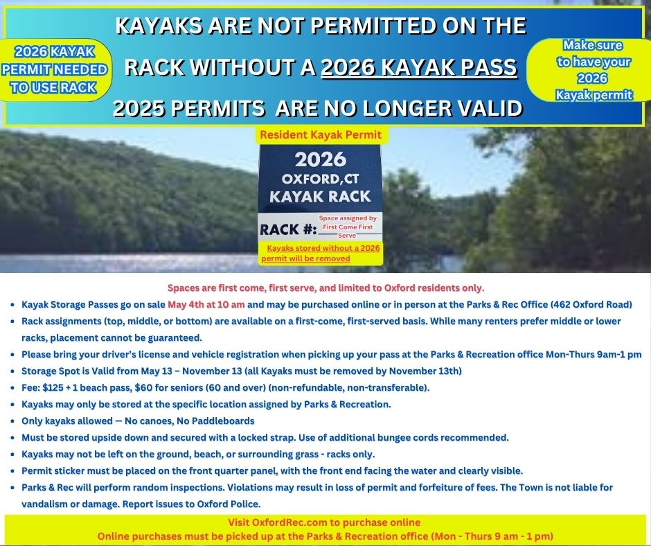 - Kayak Storage Passes go on sale May 4th at 10 am and may be purchased online or in person at the Parks & Rec Office (462 Oxford Road)