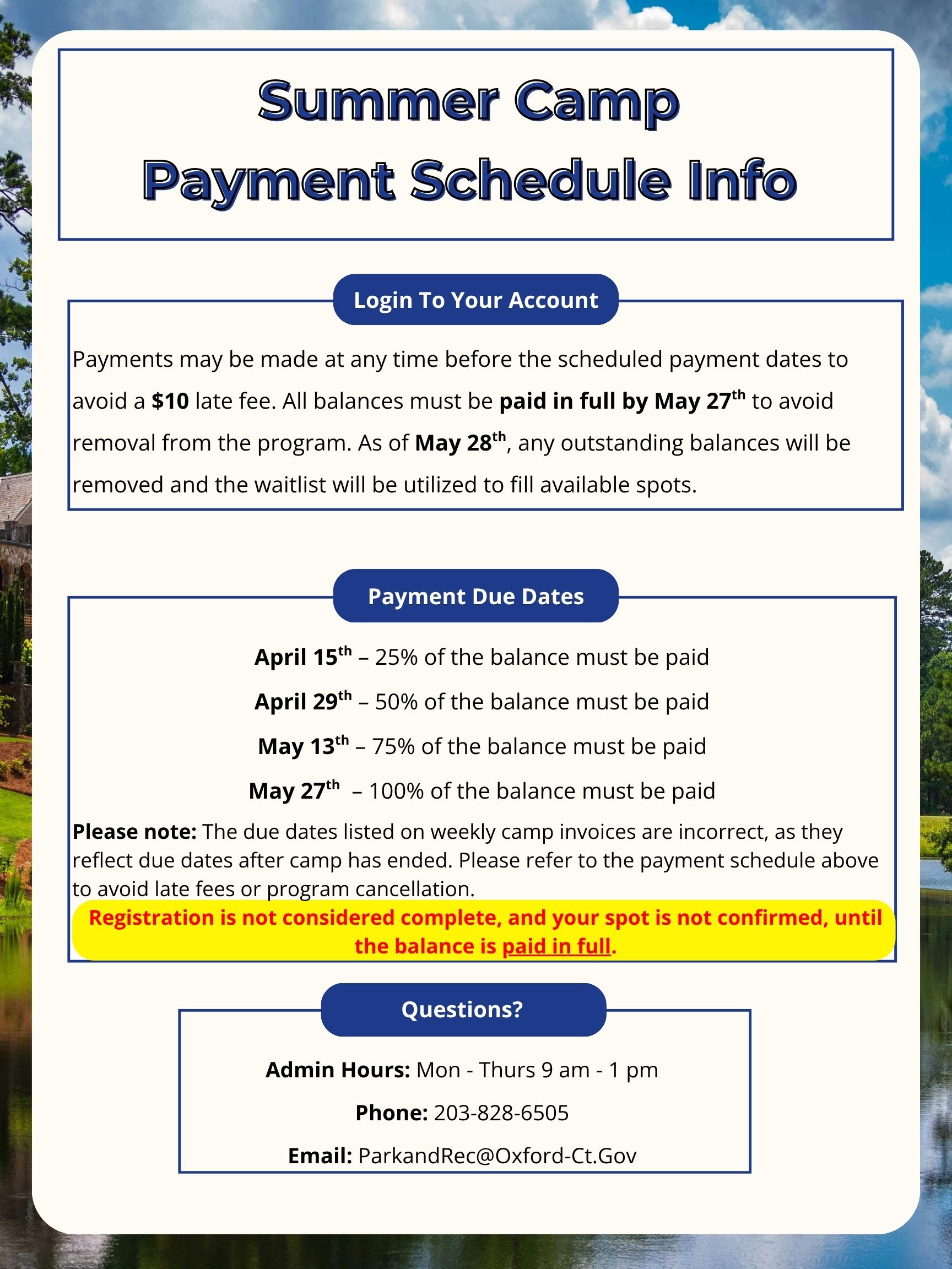 - Notes: All Payment Arrangements Must Be Paid In Full by May 27th. May 28th all outstanding balances will be removed and waitlist will be utilized to fill spots.