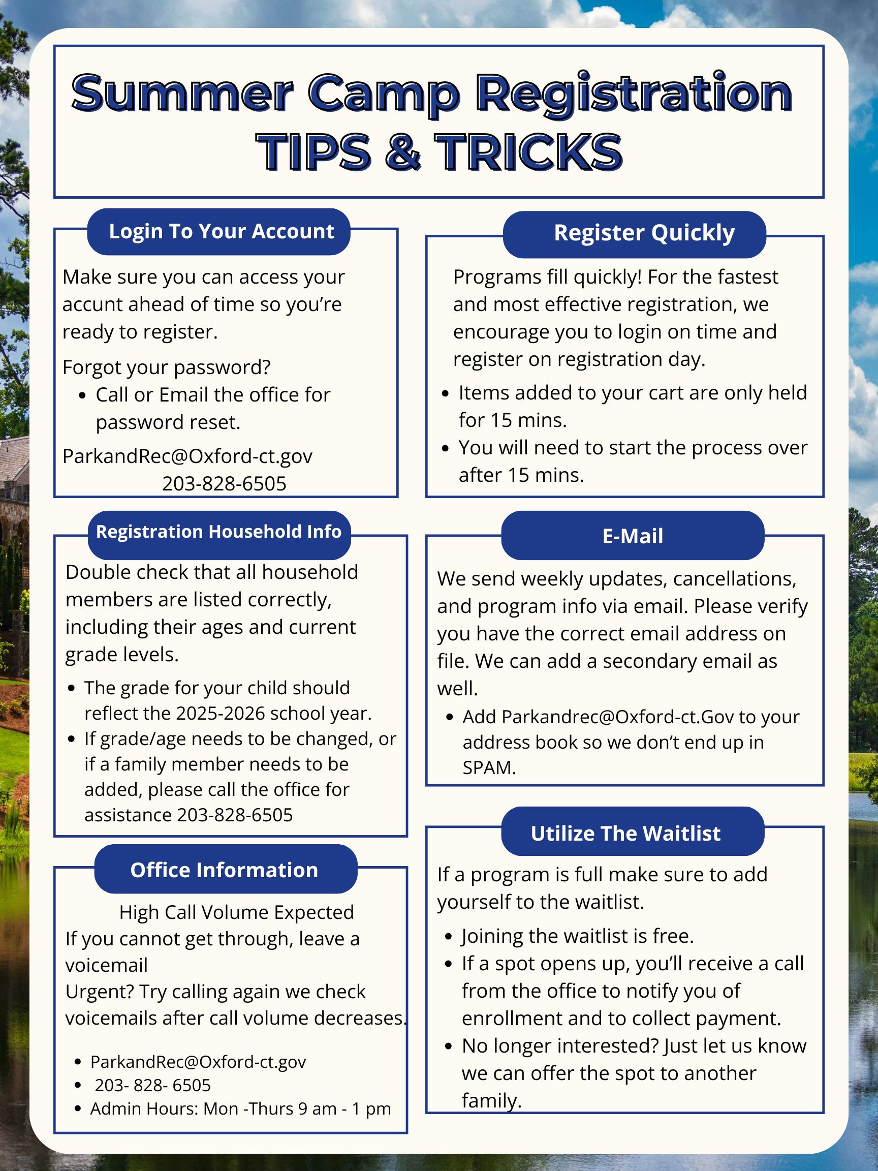 If rain is expected for most of the day, camp will move to the Oxford Municipal Annex.